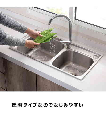 透明色のPVC素材により、金属製のシンクから木目までインテリアの邪魔にならず重宝します。