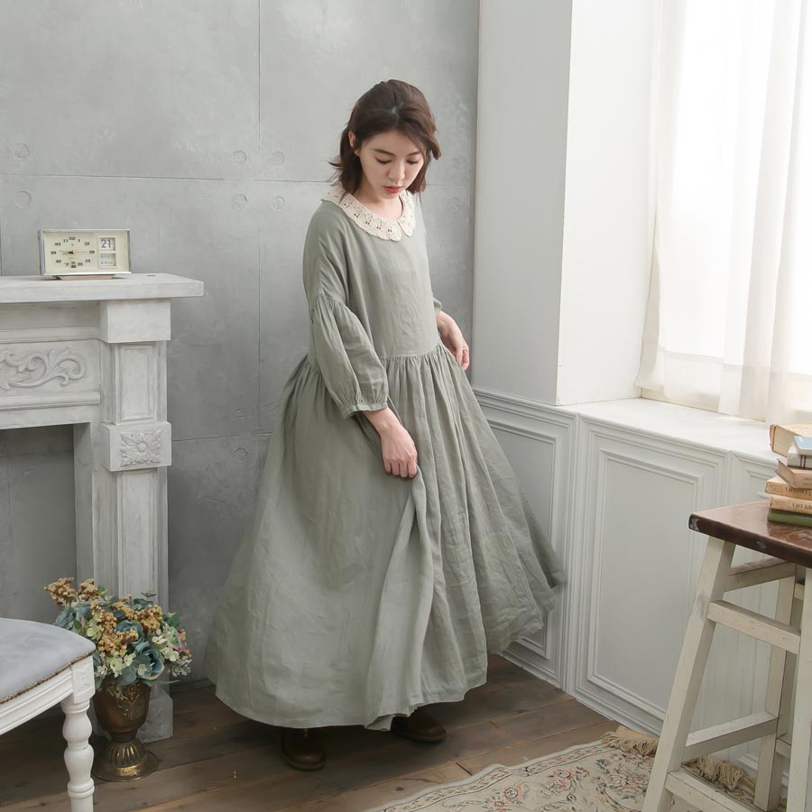 【全 2 色】 ワンピース ロングワンピース グレー 灰色 半袖 ゆったり大きめ 背中ボタン留め リネン100% 麻100% ヘンプ100% 天然素材 体型カバー ぽっちゃり オフィス 仕事 ワーク 春夏 春 夏 春服 夏服