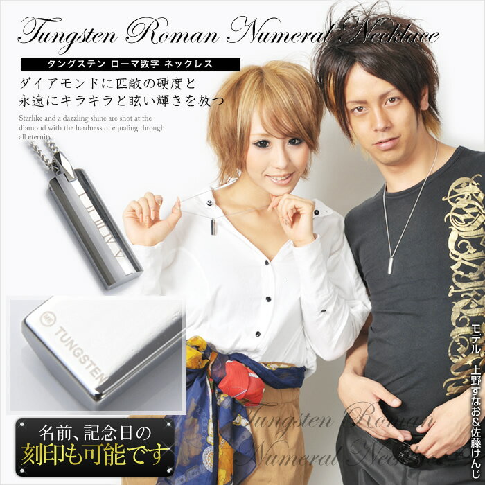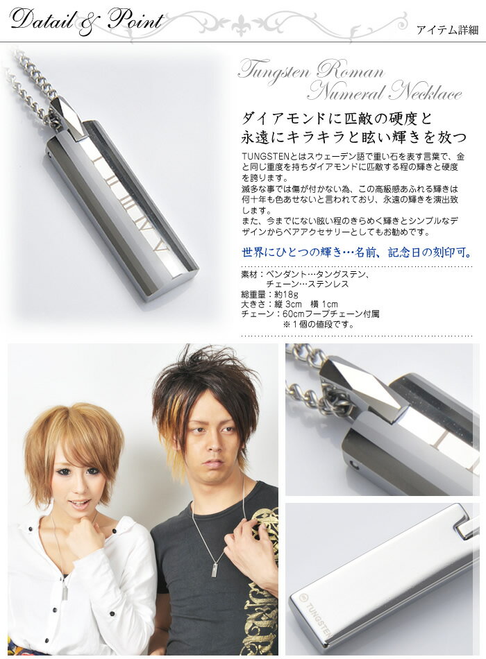 滅多な事では傷が付かない為,この高級感あふれる眩い輝きは何十年も色あせないともいわれております ■裏面に名前 記念日 メッセージの刻印出来ます 刻印内容は注文を進んで頂き【備考欄】にご記入下さい ※裏面の刻印場所は当店がバランスを見て刻印させて頂きます 【例】2013 . 12 . 24 Takuya & Misaki ■素材 ペンダント: タングステン チェーン: ステンレスチェーン 45cm 50cm 60cm ■付属品 専用ギフケース ギフトバッグ ■大きさ:縦:約3cm 横:約1cm ■ペア2個セット ----------------------- ■関連 刻印 刻印無料 名入れ イニシャル ネーム 名前 記念日 メッセージ 文字 誕生日 文字入れ 自由刻印 自由に刻印 印刻 輝く鏡面仕上げ メタリック シルバー タングステンネックレス タングステンペンダント ペンダント プレート ネームプレート METAL EVOLUTION METAL EVOLUTION メンズ レディース ペア アクセサリー ペア ネックレス ペンダント ペアネックレス ペアペンダント ペアアクセサリー ペアルック カップル -----------------------